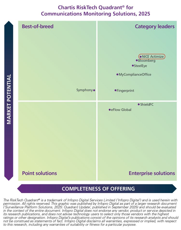 Chartis evaluated leading vendors across both trade surveillance and communications monitoring, assessing each on the breadth of their offering and market potential. The result? NICE Actimize stood out for our AI-driven innovation, multichannel oversight and regulatory alignment — three pillars that define our mission to help financial institutions detect misconduct and manage evolving risks with confidence.