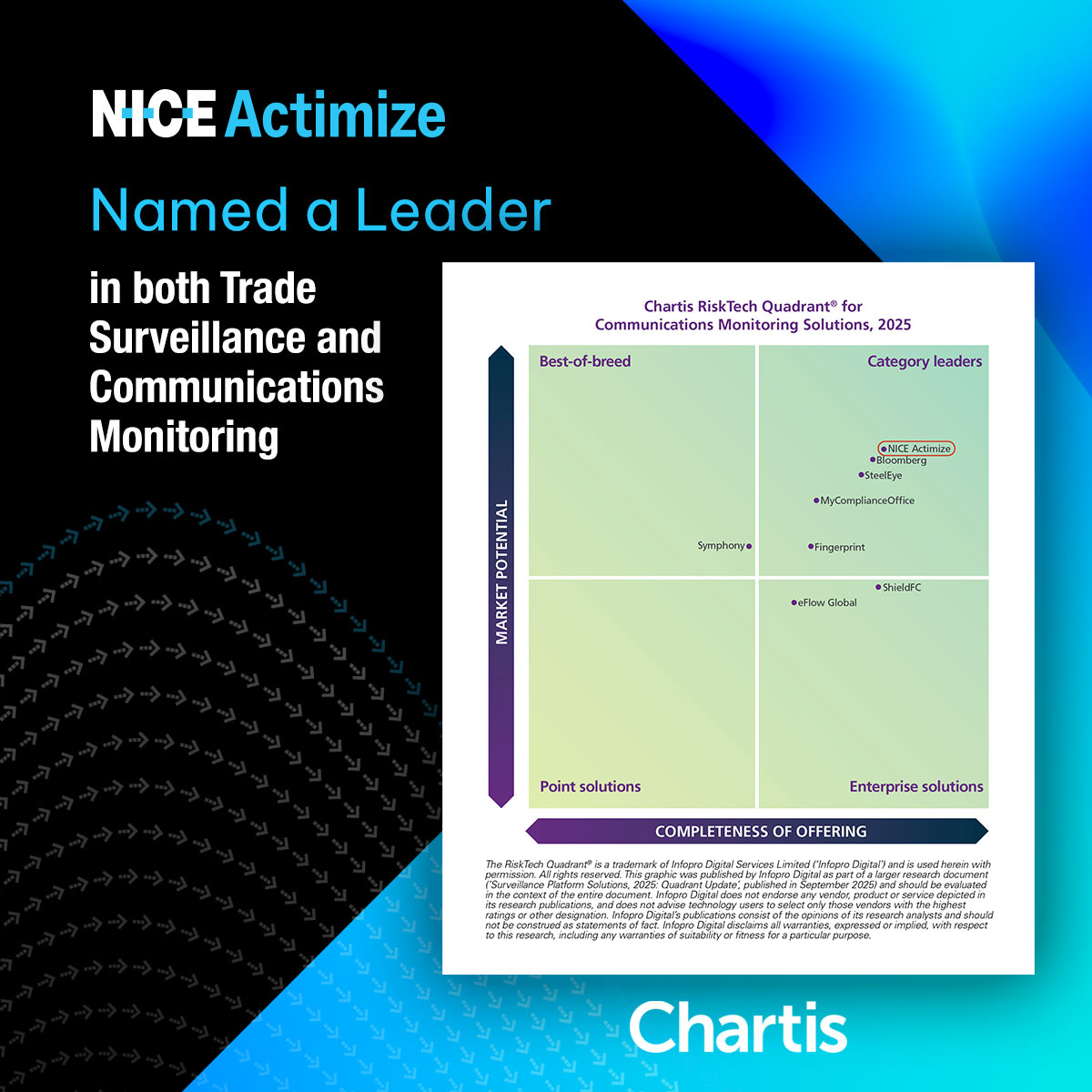 We’re proud to announce that Chartis Research has named NICE Actimize a Leader in Communications Monitoring in its 2025 Surveillance Platform Solutions Quadrant Update — recognizing our continued innovation and excellence in AI-powered compliance technology.